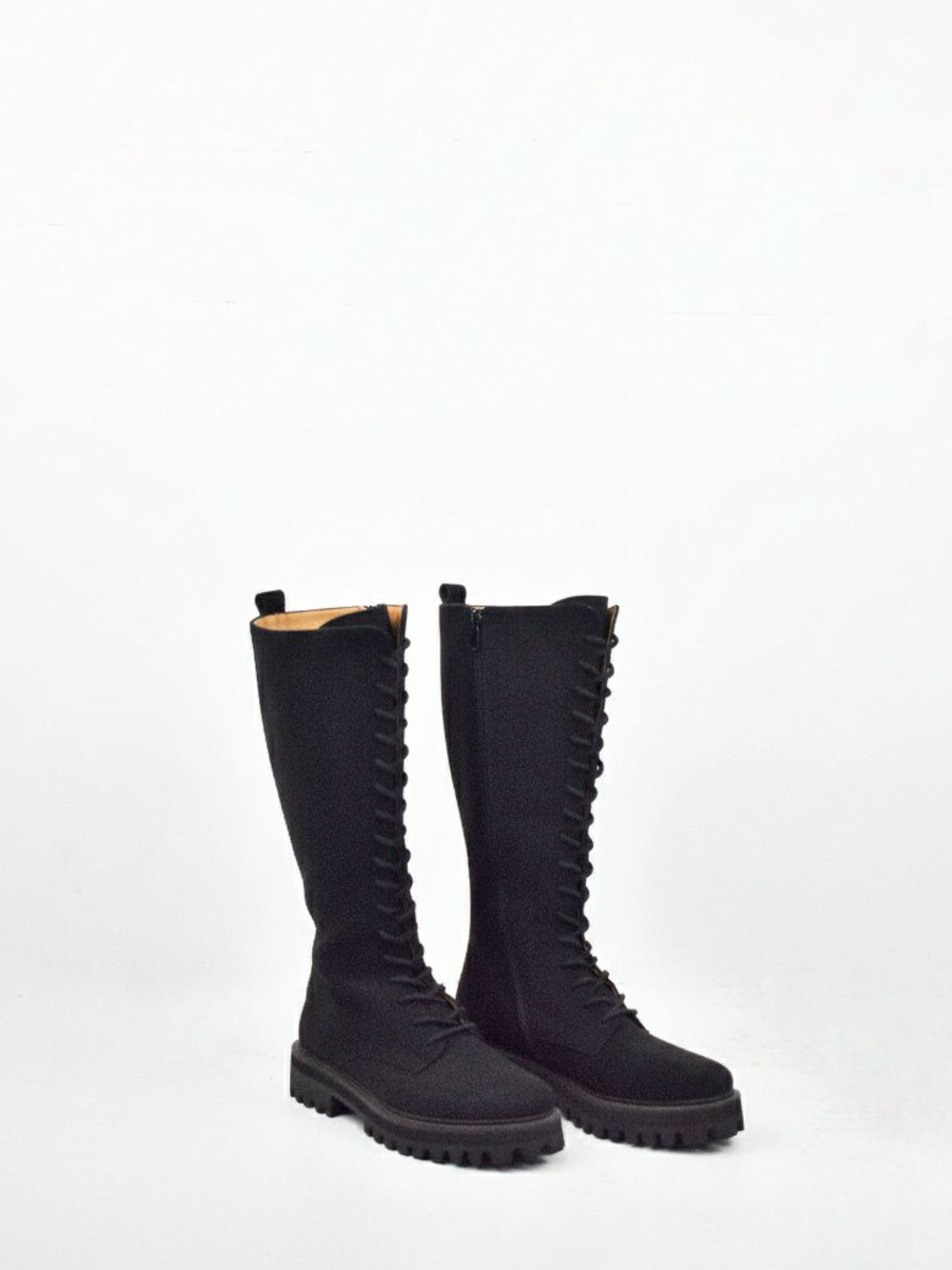 The 17 eye uppers are cut to sit on the top of your calves (size 37 measures 34cm / 13.4 inches from where your foot sits to the top of the shaft). They are crafted with a beautiful, heavier-weight vegan suede with a rougher, more traditional feel than our usual vegan suede. When you run your hand on the boot, you can feel the grain and see it move with your motion.