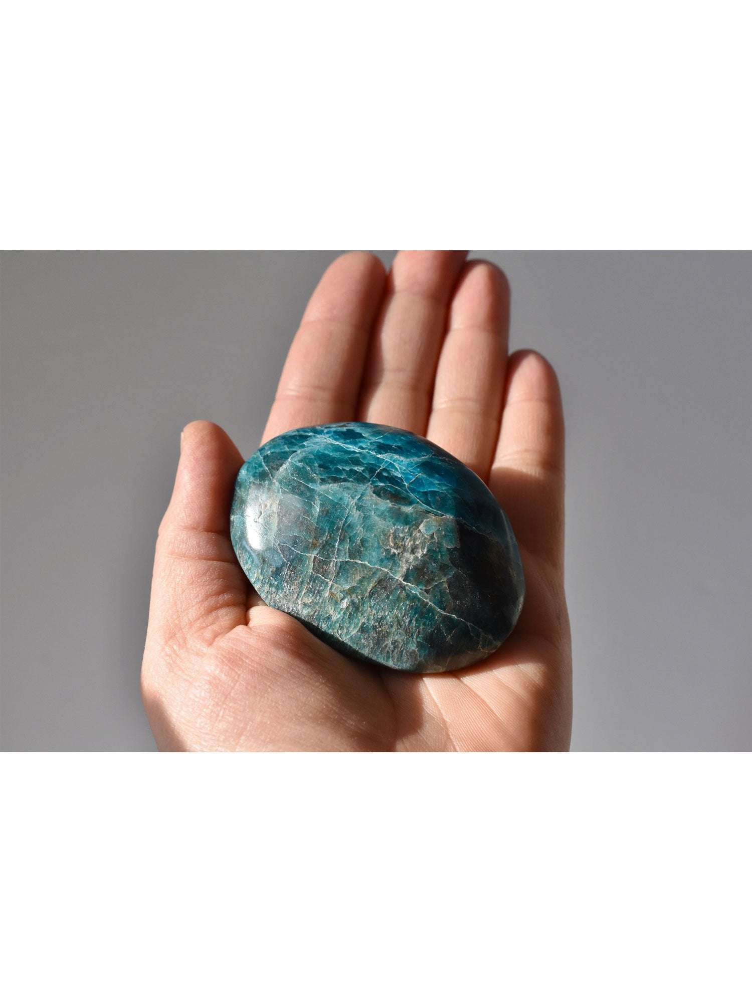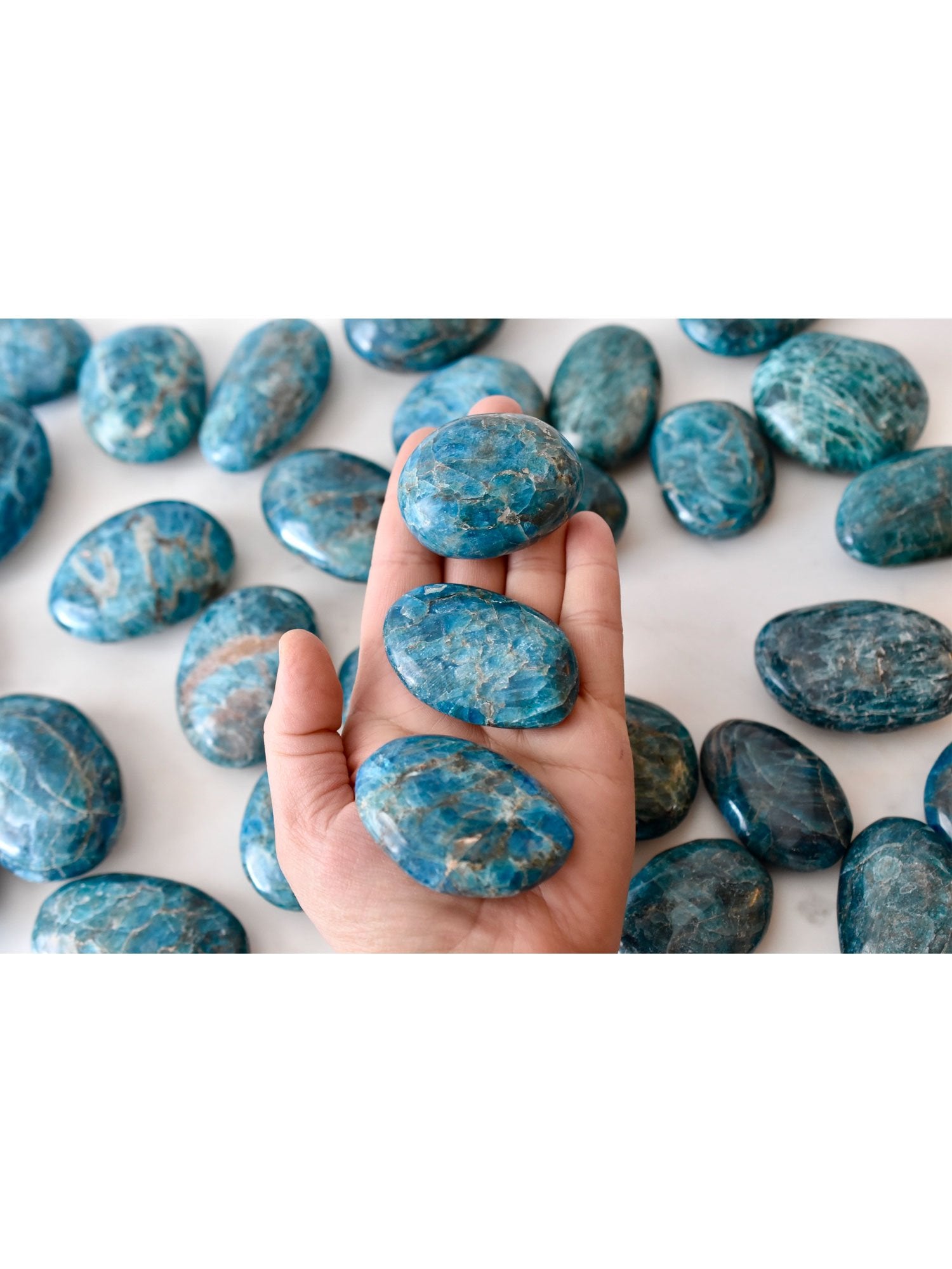 Polished natural Apatite palm stone crystals with stunning blue colors. Each crystal is totally unique. Mini approximately 1" long, Small 2" long, Medium 3" long.