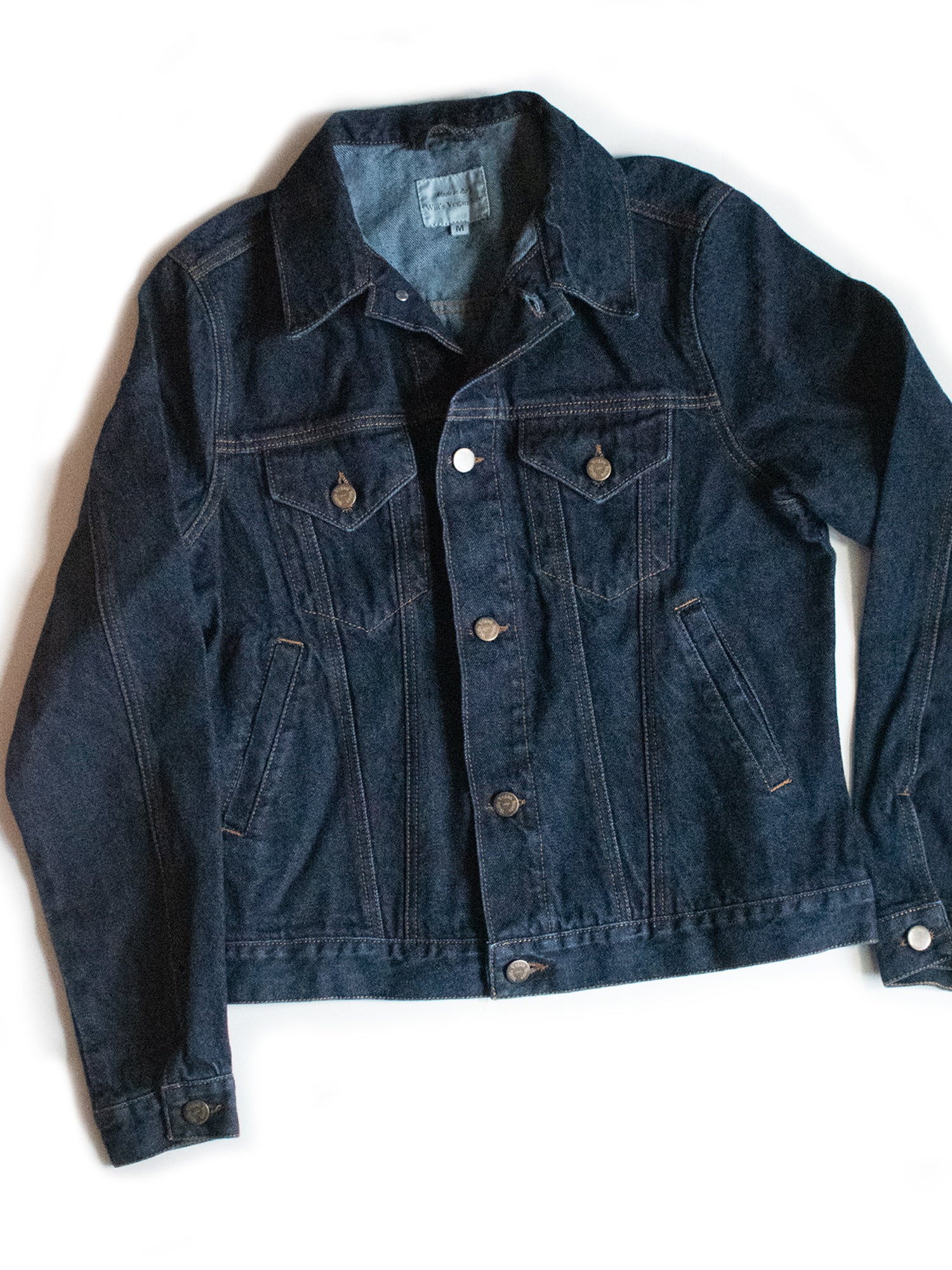 We used a heavy-weight dark blue version of our denim to make this button-up denim jacket. It's been made in small batches in Italy by a factory specialising in denim and then stone-washed to give its classic worn-out look.