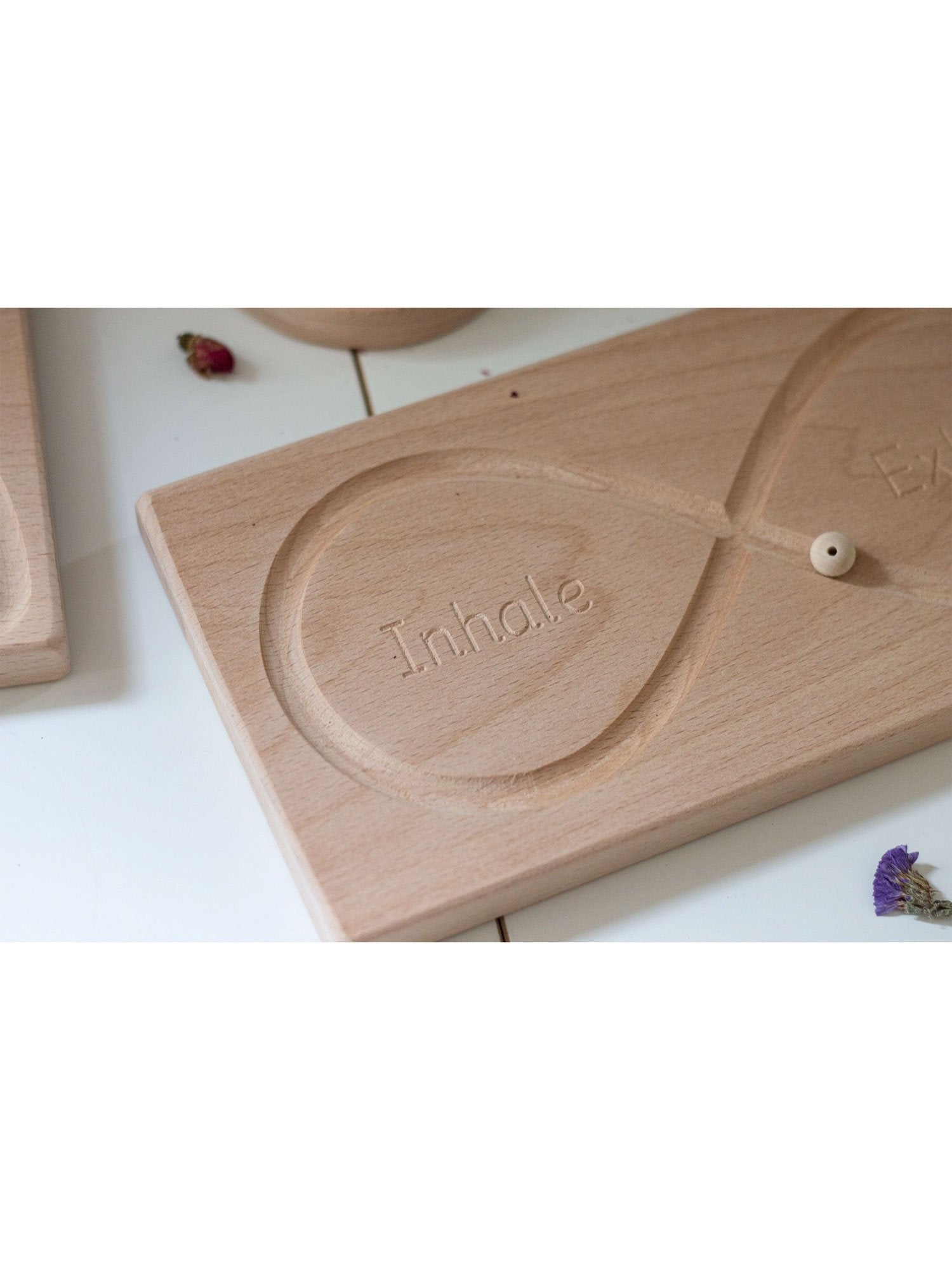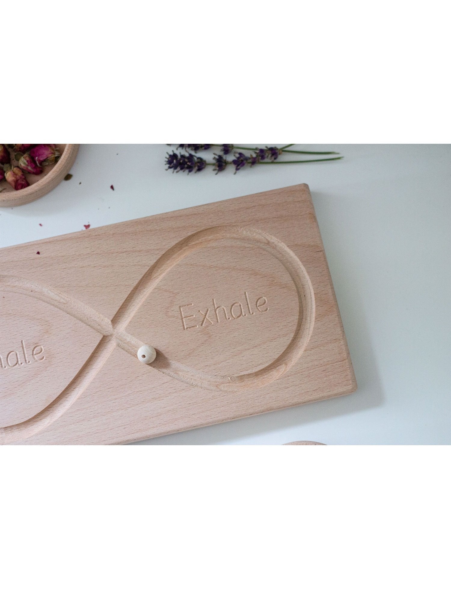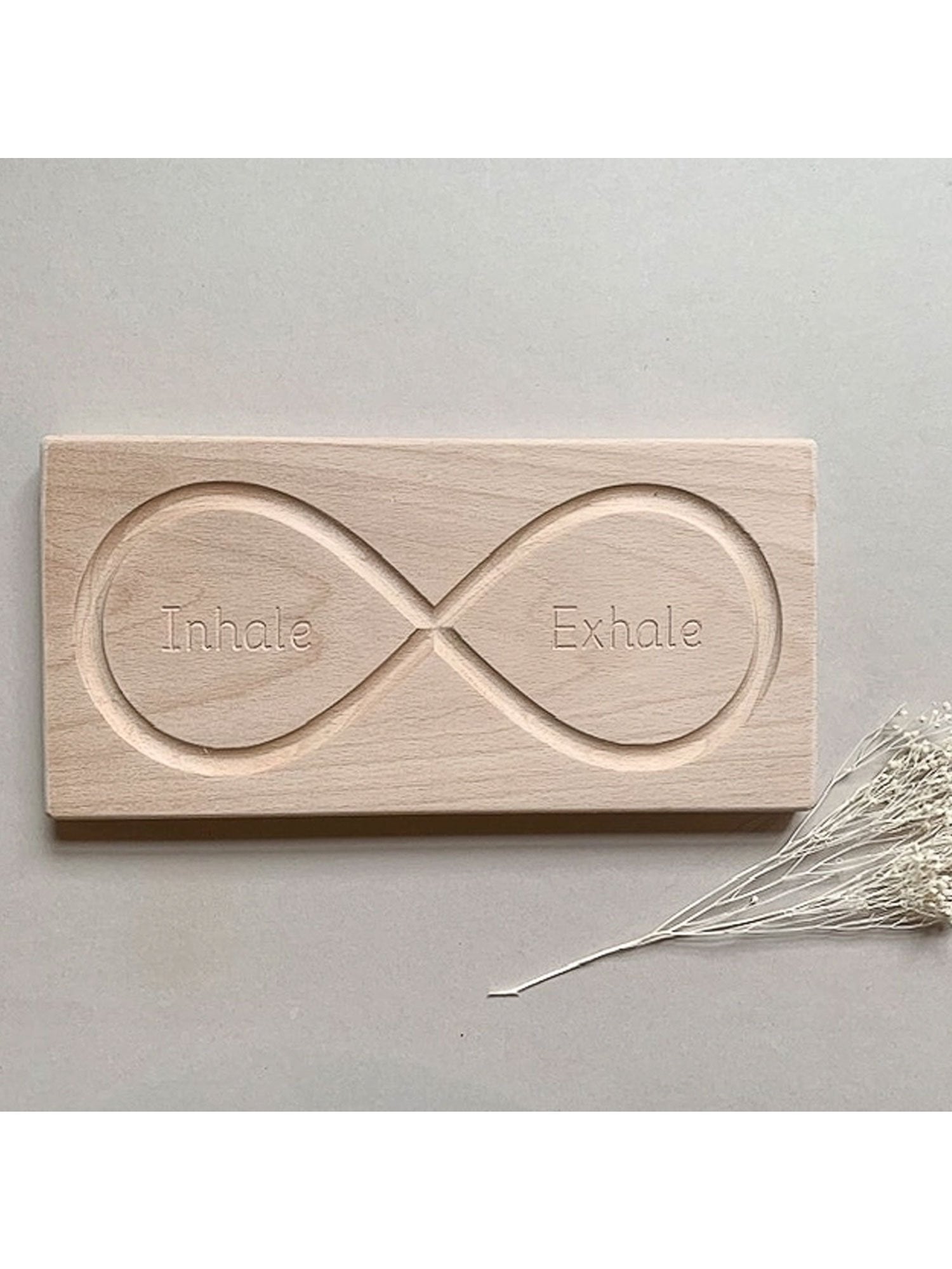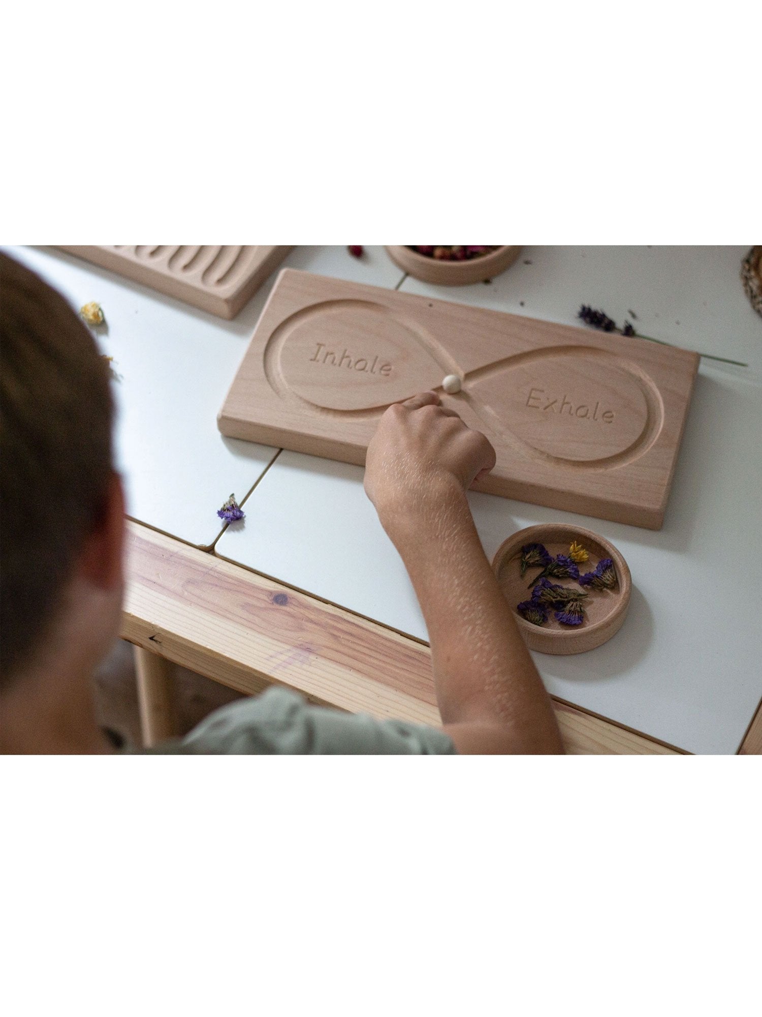 A beautifully crafted infinity board, designed to help children practice their breathing techniques. As your child traces around the left side, they inhale, and then as they move to the right side they exhale. They can do this with their finger or by pushing a small wooden ball around the board. We have engraved the words Inhale and Exhale on the board to help remind the children what they need to do.