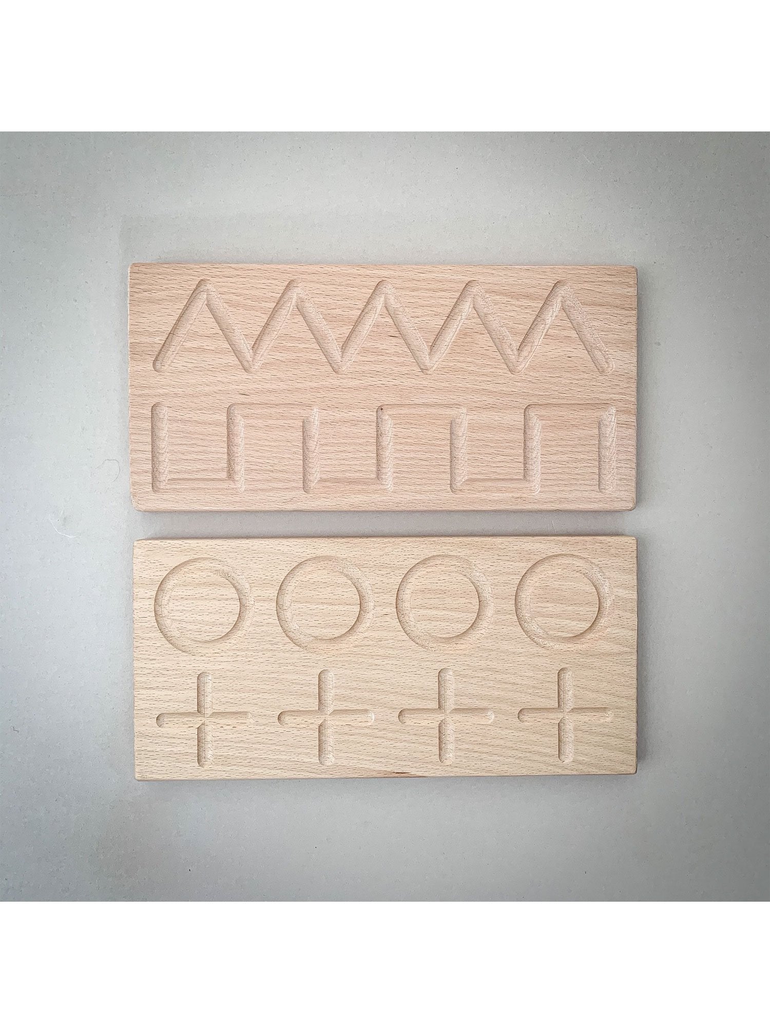 The first board focuses on the basic lines used in most letters e.g. straight horizontal, vertical, and diagonal lines, and on the reverse, we have a repeating pattern that will help your child practice those lines. The second board has curved and wavy lines which also help to form letters of the alphabet and on the reverse are the next stage shapes that will help them in forming letters.