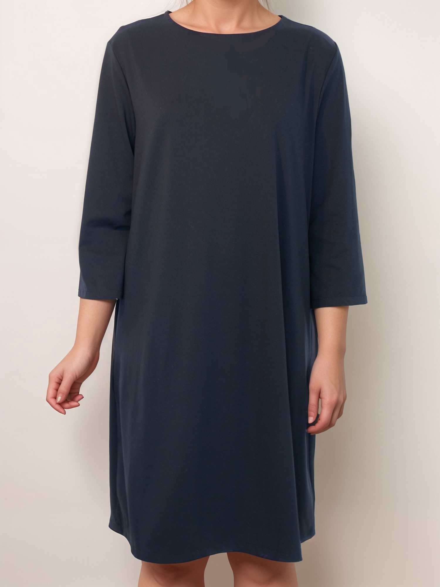 It’s a generously sized, versatile shift dress that lands at the knee or just below. It has 3/4 length sleeves with no shoulder pads. There are two discreet invisible pockets for comfort and ease of wear. There’s a simple one button closure at the back. Like everything we make & do, our clothing is certified Carbon Neutral.